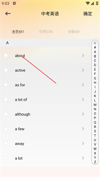 2、在词汇分类页,选择目标考试大纲(如“中考英语大纲词汇”),点击即可进入对应词汇列表。