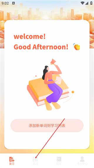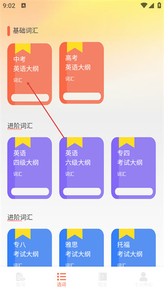 1、进入应用后,点击底部【选词】,可进入词汇分类选择页面。