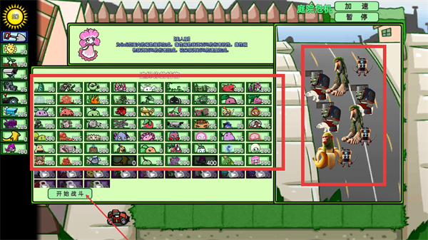 1、选择【向日葵-50】【坚果-100】等植物组合,为抵御【巨人僵尸】【路障僵尸】做好防线准备。