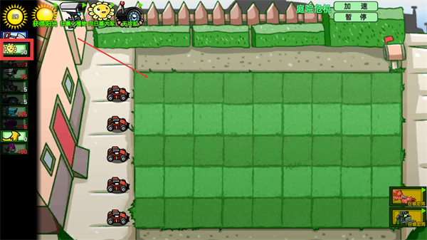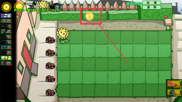 2、优先种植【向日葵】积累阳光,借助【小推车】备用防御,为后续布置炮塔储备资源。