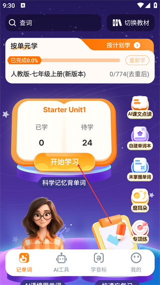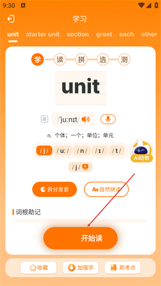 4、进入单词学习页,可点击【开始读】进行跟读学习单词。