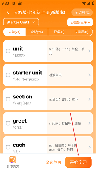 3、在单元词汇列表页,点击【开始学习】,可进入单个单词的详细学习界面。