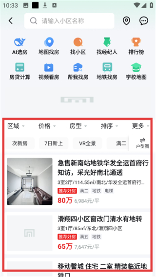 2、进入房源列表页后,可通过区域-价格等筛选条件缩小范围,点击心仪房源就能进入详情页哦。