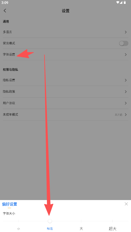 3、在设置页面的“字体设置”分类下点击“字体大小”即可进入调整界面。