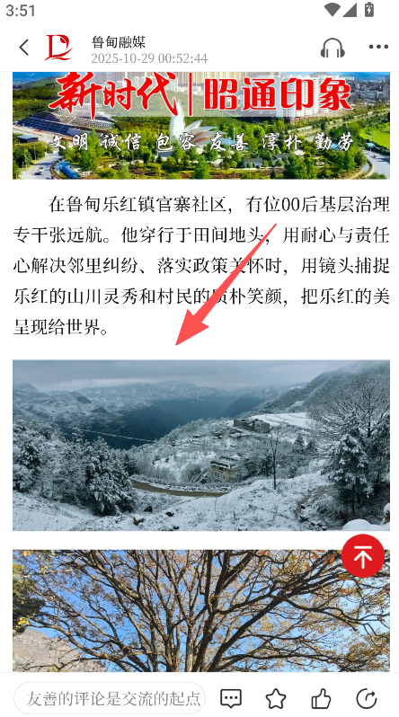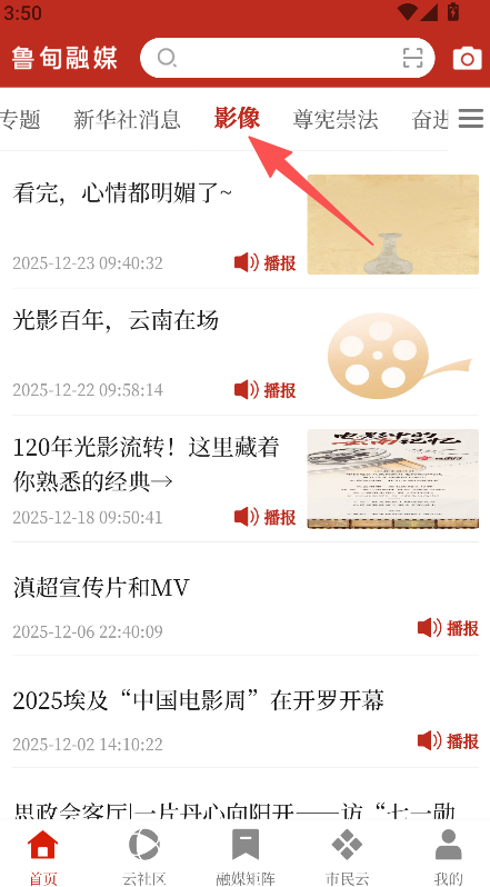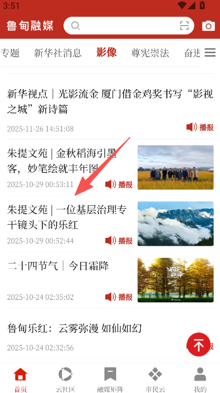 《鲁甸融媒》是一款提供多元资讯的软件,设专题新华社消息影像等频道,影像板块推送光影相关内容、本地治理资讯、节气信息等,每条资讯标注发布时间并配备播报功能,底部设首页云社区融媒矩阵市民云我的等板块,点击资讯可进入详情页,查看文字与配图内容,满足不同资讯的获取及浏览需求。