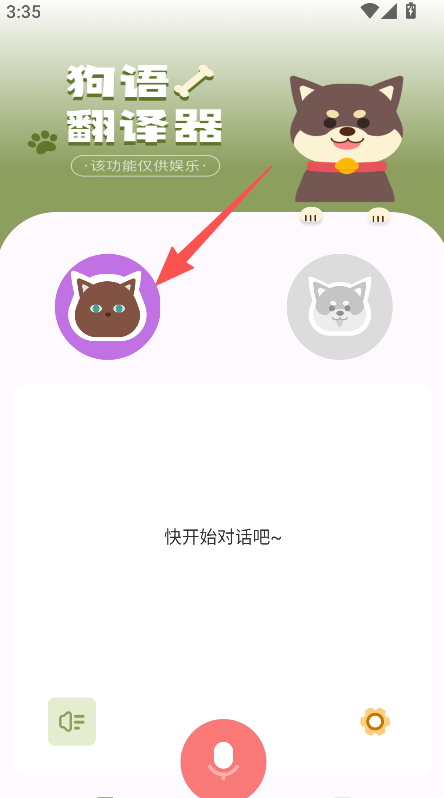 1、提供动物标识选择功能,在狗语翻译器板块点击猫狗标识,切换对应动物的互动模式。