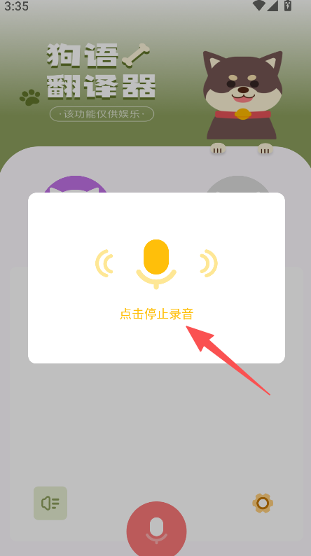 《猫狗类动物交流器》是一款提供猫狗类动物交流趣味功能的软件,设狗语翻译器板块,标注该功能仅供娱乐,提供猫狗标识选项,点击对应标识后可启动录音,录音时显示点击停止录音提示,录音后呈现多种动物叫声选项如悠闲、做梦、小警犬等,可选择对应选项互动,以趣味形式模拟与猫狗的交流,带来休闲娱乐体验。