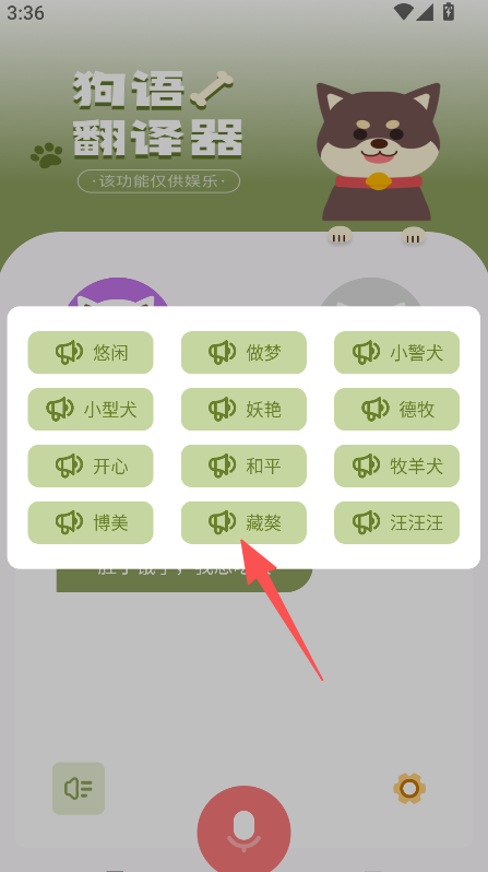 1、打开软件进入狗语翻译器板块,选择对应动物标识。