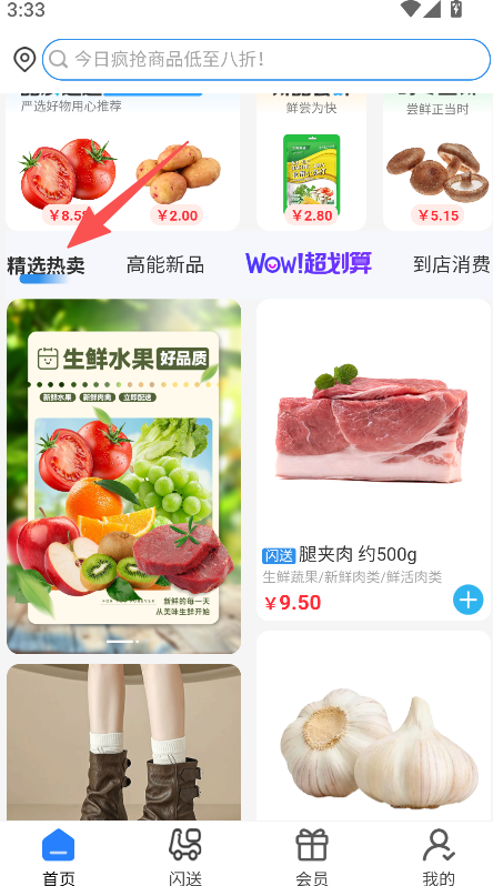 1、设精选热卖高能新品等板块,展示果蔬肉类等商品及对应价格,分类呈现便于快速定位所需商品。