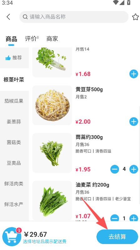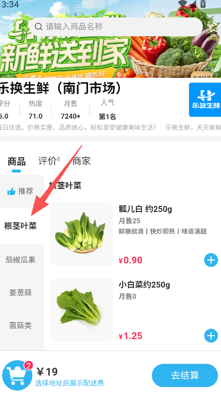 2、店铺内分根茎叶菜等品类排布商品,标注月售数量及商品特点,商品信息展示全面。