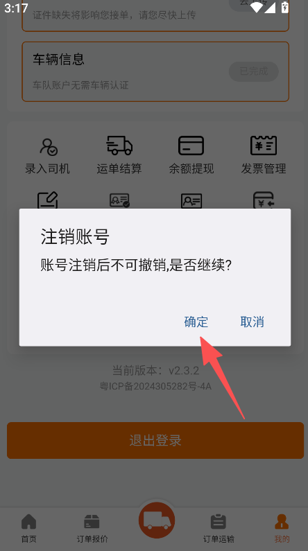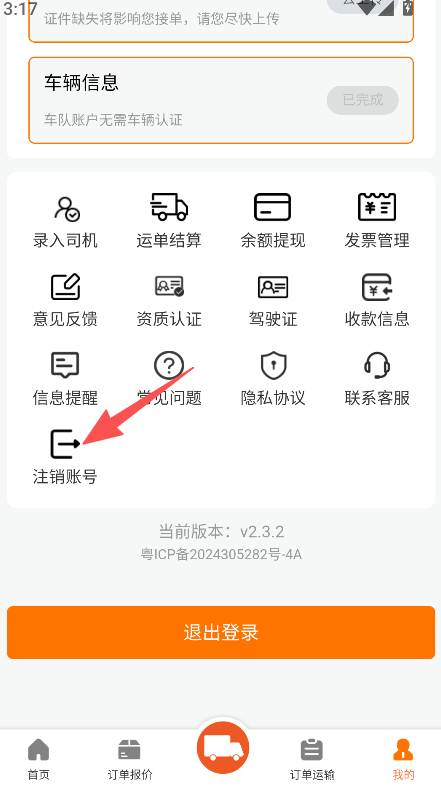 《掌运物流系统》是一款服务物流车队的软件,设车队板块展示车辆信息,区分车队账户所需车辆信息类型,提供实名认证、车辆信息认证通道,完成认证可自由接单,功能入口含录入司机、运单结算、余额提现、发票管理等,设注销账号功能,操作时弹出账号注销后不可撤销的提示,需确认后完成操作,覆盖物流车队的认证、接单、结算及账号管理等相关事务,满足物流运营的基础流程需求。