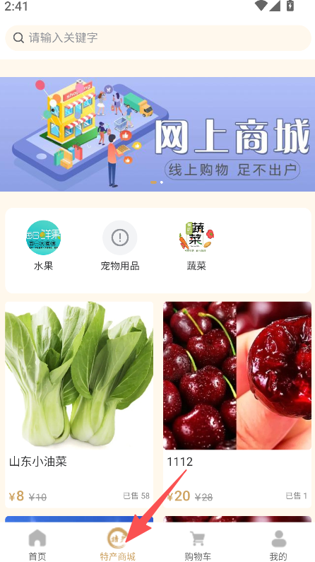 1、设网上商城板块并分水果、宠物用品等分类,展示商品标注价格及已售量,分类清晰便于快速定位所需商品。