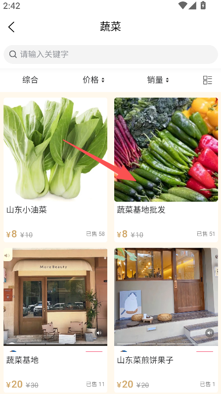 2、支持商品排序功能,在商品页点击综合、价格等选项,调整商品的展示顺序。