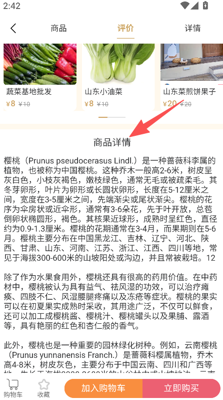 3、商品详情页呈现商品介绍内容,配备加入购物车、立即购买功能,衔接购物流程。