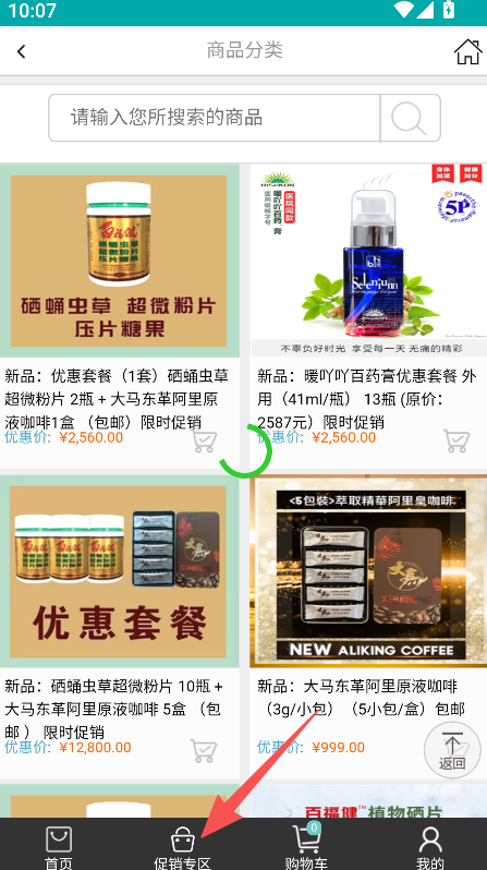 1、提供商品浏览功能,在商品分类页或促销专区,查看硒蛹虫草、咖啡等健康类商品的信息。