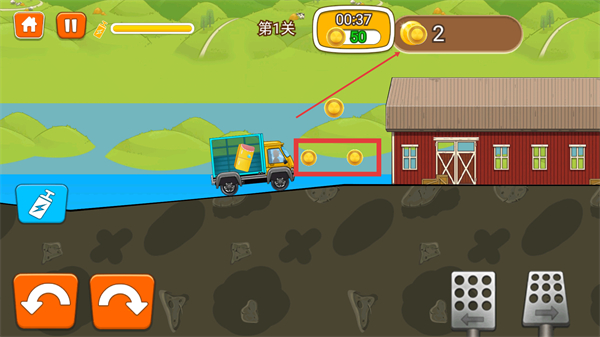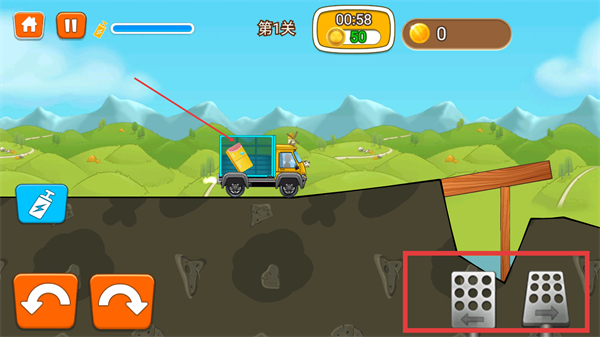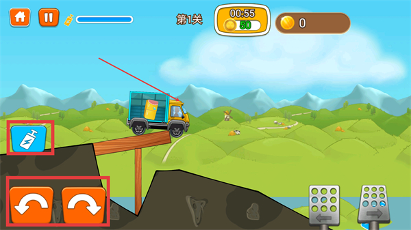 1、操控【方向按钮】保持卡车平衡,观察前方山地路况,合理调整行驶路线,避免车辆倾斜或掉落。