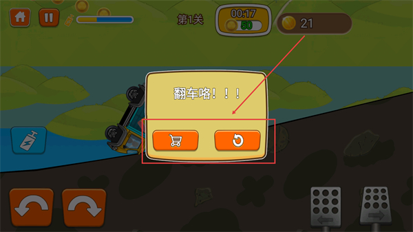 4、翻车后选择【重新开始】,调整驾驶策略,关注地形变化,保持车辆稳定通过复杂路段。