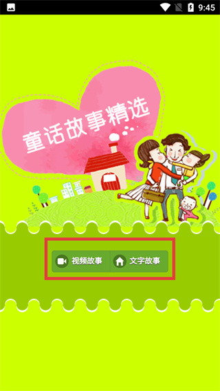 1、进入【童话故事精选】页面,可看到【视频故事】、【文字故事】两个功能按钮,点击【文字故事】按钮进入文字类童话板块。