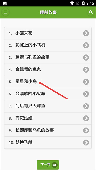 3、在【睡前故事】列表页,可看到《小猫采花》-《星星和小鸟》等故事条目,选择【星星和小鸟】这个条目进入故事内容页。
