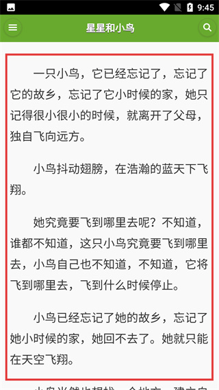 4、进入【星星和小鸟】的故事内容页后,即可阅读该睡前故事的文字内容,沉浸式体验这个睡前故事的阅读过程。