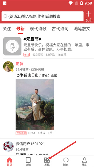 1、处于展示各类作品的首页,点击底部导航栏的【发现】按钮,进入功能分类的发现页面。