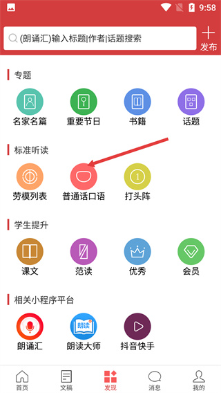 2、在发现页面的【标准听读】板块下,点击【普通话口语】选项,进入普通话口语评测页面。