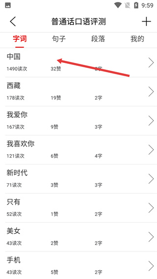 3、进入普通话口语评测页面后,在【字词】分类列表中,选择【中国】这个字词条目进入详情页。