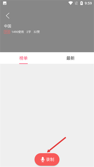 4、在“中国”的字词详情页,点击底部的【录制】按钮,即可开始该字词的口语评测录制流程。