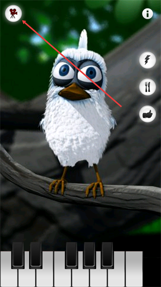 1、界面左上角的【摄像机】按钮可触发录制功能,同时可通过底部钢琴键与小鸟互动,右侧还有【闪电】【餐具】等功能按钮。