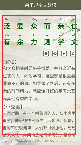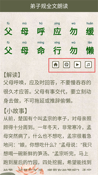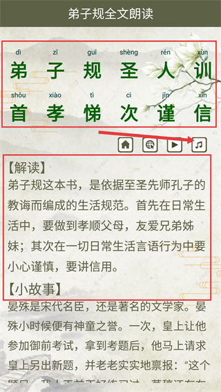 1、进入《弟子规》全文朗读页面,可查看内容原文、解读及配套小故事,点击页面的音乐图标进入分段展示页。