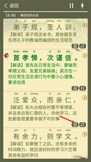2、在分段展示页,会呈现《弟子规》的分段内容与对应解读,选择对应的分段进入该分段的学习界面。