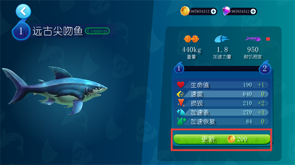 1、在鲨鱼界面消耗金币点击【更新】,提升【远古尖吻鱼】的属性,增强其战斗能力。