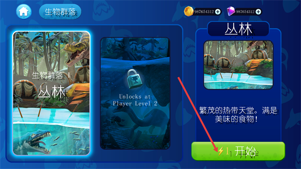 2、选择【丛林】生物群落,点击【开始】按钮进入该区域,这里可获取丰富的食物资源。