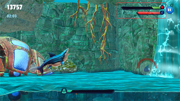 4、留意右上角的血量条,持续捕食目标维持状态,同时探索场景收集更多资源强化鲨鱼。