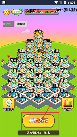 1、进入游戏界面,点击【开始游戏】进入关卡,界面含地区建筑布局,可查看【排行榜】功能辅助操作。