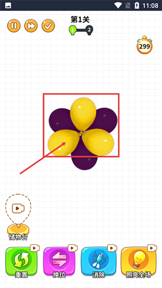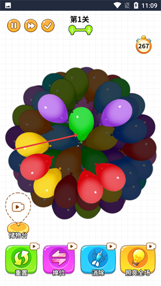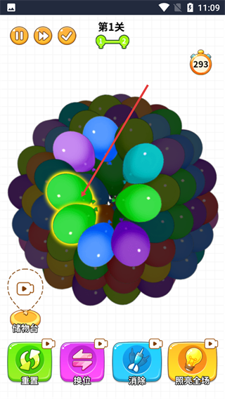2、进入【第1关】后,先识别画面中的【黄色气球】,找到三个同色气球,可借助界面的【重置】【换位】等功能辅助完成匹配。
