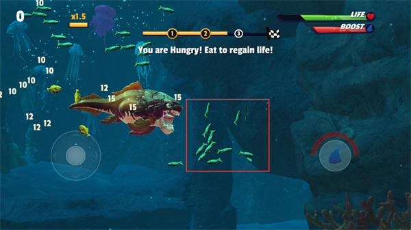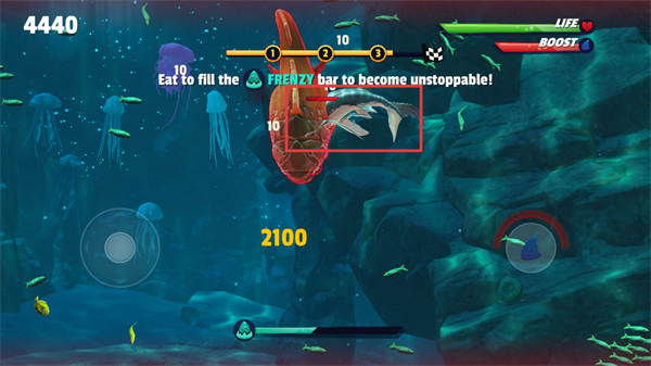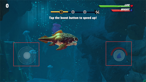 1、操控左侧移动按钮控制鲨鱼走位,点击右侧【BOOST】按钮加速,按提示提升移动效率。