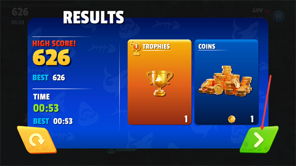 4、关卡结束后查看界面,获取奖励,点击箭头按钮进入下一局。
