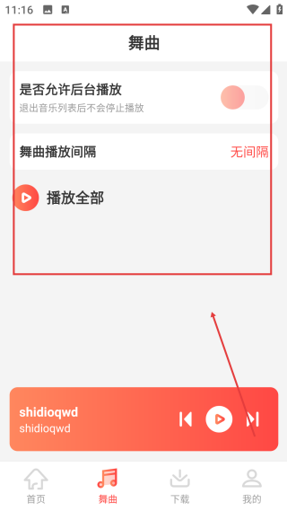 3、进入舞曲页面,可【设置后台播放权限,调整播放间隔】,点击播放全部播放舞曲。