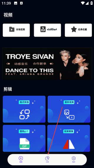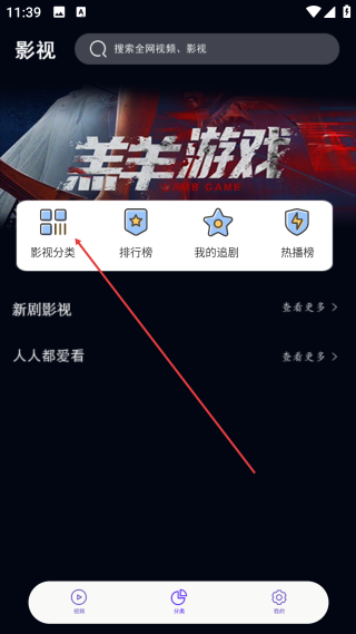 1、进入视频页,点击底部【分类】选项,进入影视分类的功能页面。