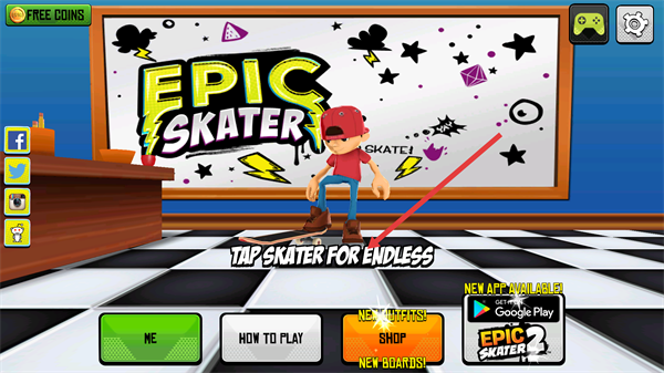 1、进入【EPIC-SKATER】游戏主界面,点击滑板角色触发【TAP-SKATER-FOR-ENDLESS】模式,即可开启游戏流程。