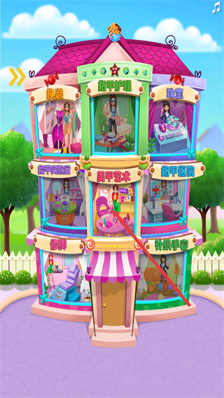 1、在【时尚公主指甲美甲】主界面,点击中间的播放按钮,即可进入美甲功能选择的建筑页面。
