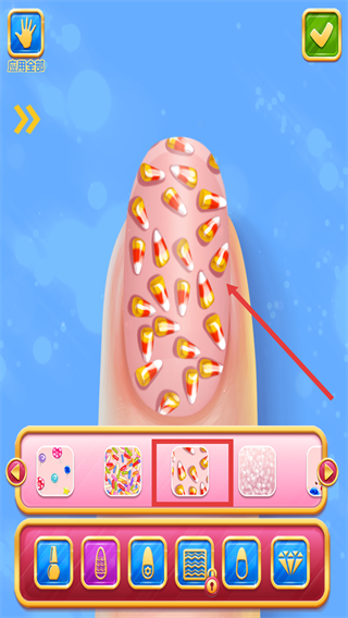 3、在美甲操作界面,从底部素材栏选择装饰元素(如糖果图案),点击指甲区域即可应用该装饰样式。