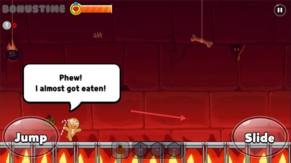 2、关卡中点击【Jump】按钮控制姜饼人跳跃,避开下方火焰等危险区域,持续推进。