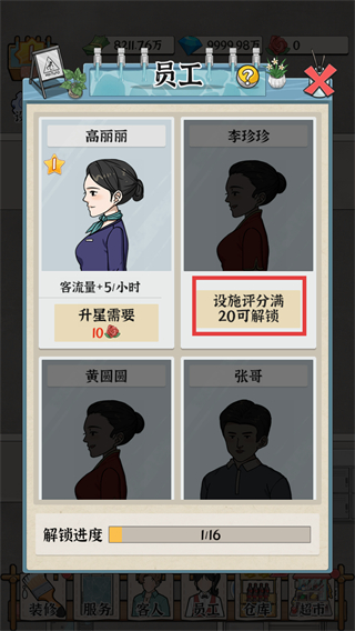 3、在【员工】界面中,当达到解锁条件时解锁员工,获取新员工来提升浴场的运营效率。