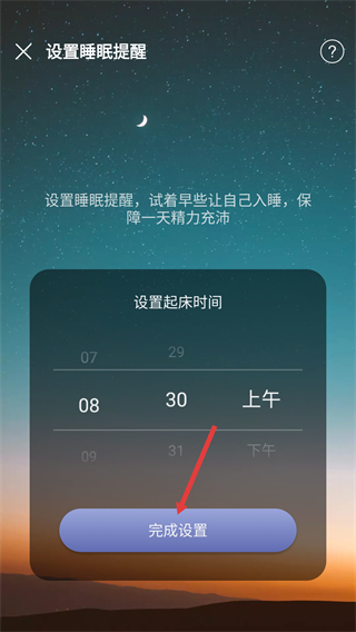 3、在设置睡眠提醒页面,选定起床时间后,点击“完成设置”按钮确认配置。