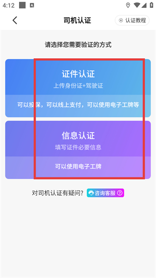 3、在司机认证页面,可选择“证件认证”或“信息认证”方式,不同方式对应不同的功能权限。