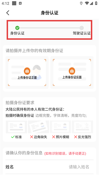 4、选择“证件认证”后进入身份认证页面,需按要求上传身份证正反面等材料完成认证。