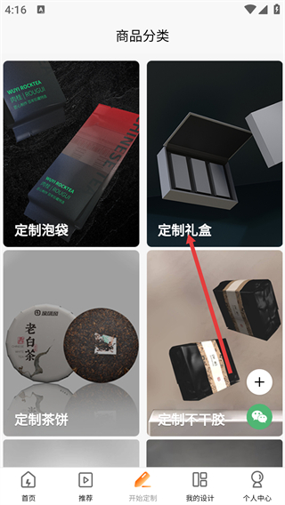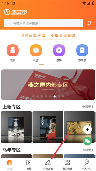 1、在速创意首页,点击底部导航栏的“开始定制”选项,进入商品分类选择页面。