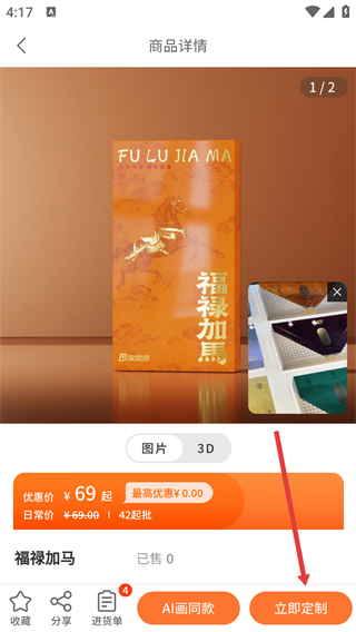4、在商品详情页确认信息后,点击“立即定制”按钮,启动该商品的专属定制流程。